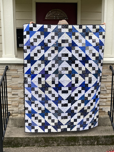 I love this batch! That simple blue patchwork quilt is so effective. I also am loving the current drive quilts. It took me a minute to find the wonky block you noted. IT still looks amazing and I'm grateful to remember, once again, that none of us is perfect! I have a RW&B quilt I"m working on that will come your way eventually. Is there a certain size you prefer for those? Maybe I'm almost there!